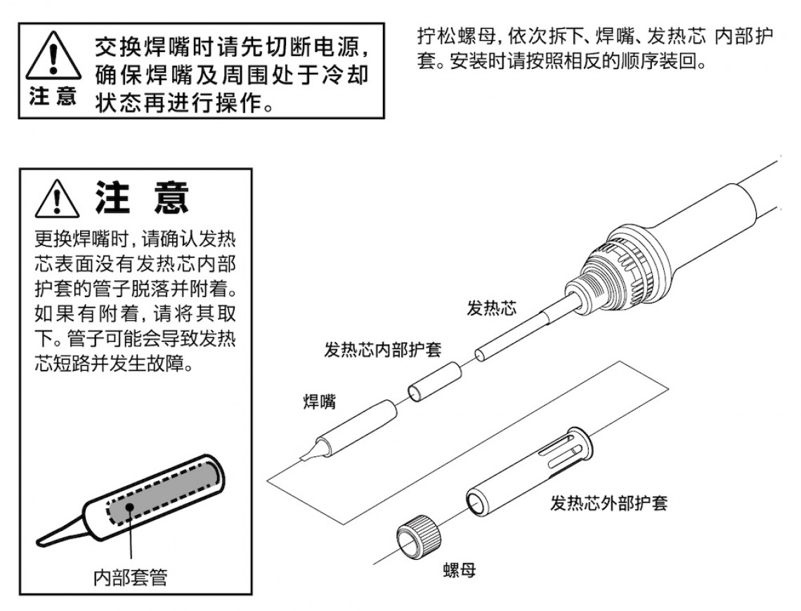 〈注意〉更换焊嘴时,请确认焊嘴内部的管件未脱落并附着在本体发热芯表面。如发现发热芯上附着有管件,请先将其取下,再更换新的焊嘴。若未将管件取除,可能会导致发热芯短路并引发故障。