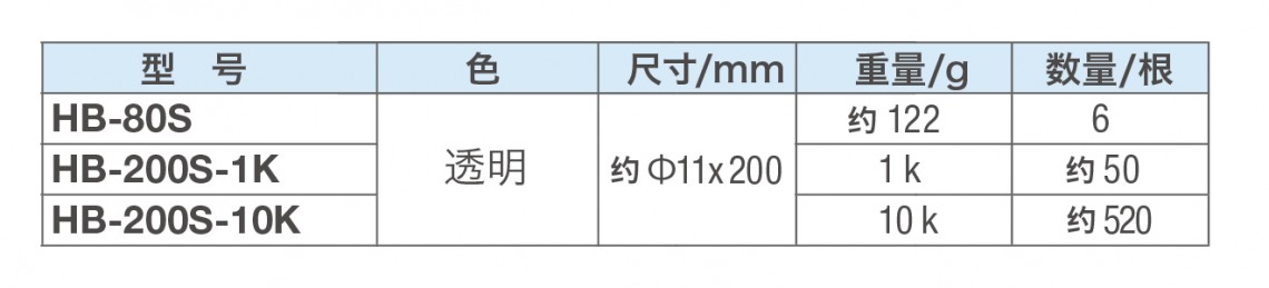 | HB-80S | 透明 | 约φ11×200 | 约22 | 6 |