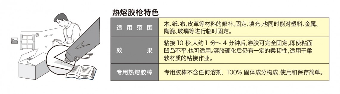 加热融化胶棒涂布,冷却后即可粘接。最适合少量接着的快速作业。