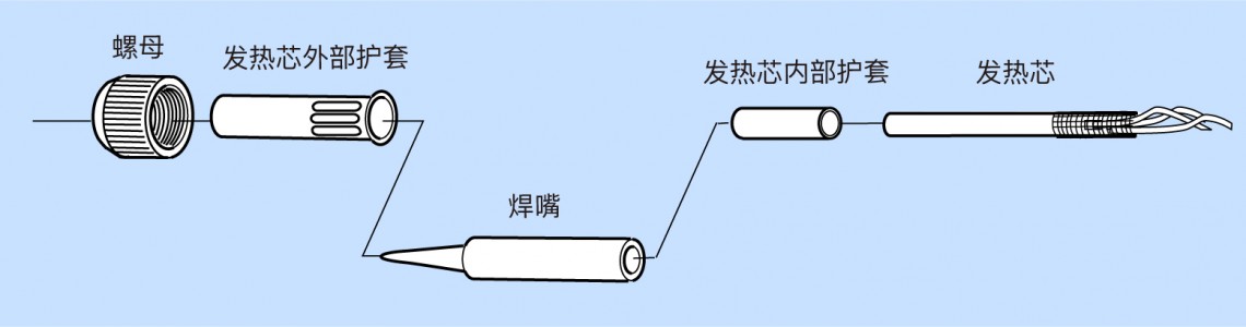 松开螺母,依次取下发热芯、焊嘴和垫圈;安装时请按相反顺序进行。