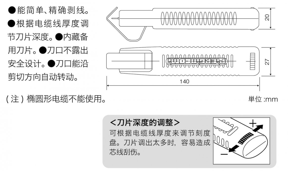根据电缆线厚度调 节刀片深度